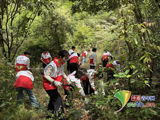 4月1日,共青团广西壮族自治区桂林市恭城瑶族自治县委组织西部计划志愿者团支部全体成员前往峨山弄(颐园)谭铠墓,开展清明祭扫活动。图为参加活动的西部计划志愿者清理谭铠墓旁的杂草。乔韦莲摄