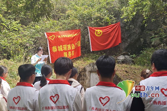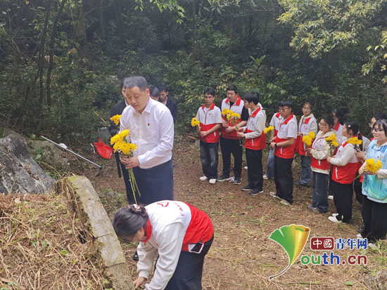 团恭城瑶族自治县委书记龙兴与西部计划志愿者们向谭铠同志敬献鲜花。方华理摄