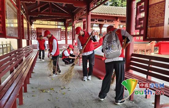 昌宁县职业技术学校学生在昌宁县田园镇新城红色教育基地打扫卫生。东北大学研支团供稿