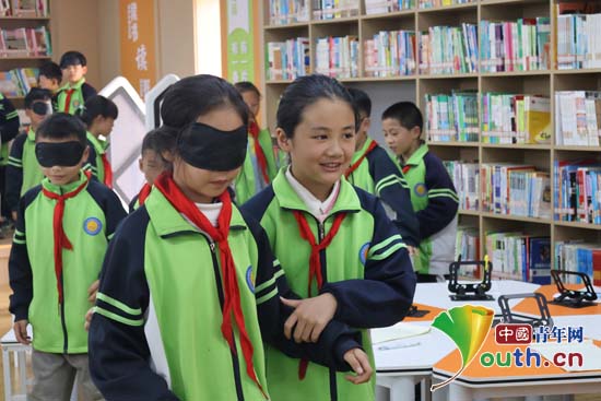 为了让孩子们深刻理解视障人士的生活困境,现场特别设置了“黑暗体验”环节。学生们两人搭档,一人戴上眼罩扮演“视障者”,另一人在旁用语言指引伙伴绕过桌椅障碍,并取回书本。