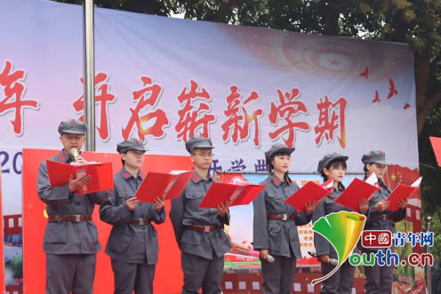开学典礼仪式上,西南大学研支团队员们表演的节目《争做新时代英雄》,讲述了党的光辉历史,并号召全体师生在新时代学英雄、敬英雄、做英雄。最后,全校师生合唱歌曲《没有共产党就没有新中国》。师生们在浓重的红色氛围中感受党和祖国的伟大,燃烧着爱党、爱国之情。