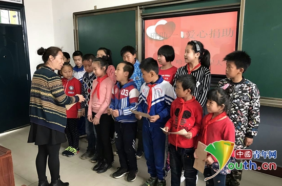 哈尔滨工程大学第七届研究生支教团在春阳镇民族联合小学举行爱心捐助金发放仪式。图为学校大队辅导员为孩子发放助学金。哈尔滨工程大学研支团 供图