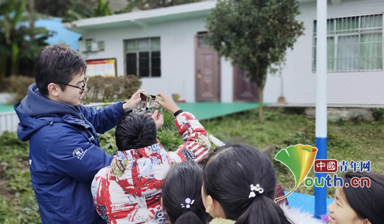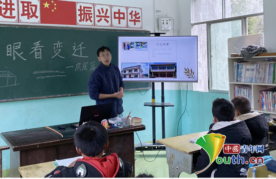 志愿者魏邦昊给学生展示大石小学曾经的老照片。华农大研支团志愿者刘芝宁 供图