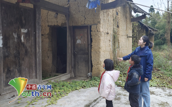 志愿者刘芝宁带领学生参观村中的老木屋。华农大研支团志愿者刘芝宁 供图