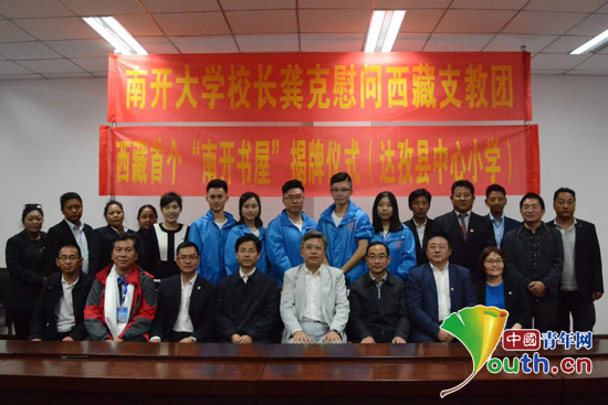 图为西藏首个“南开书屋”揭牌仪式上,时任南开大学校长龚克慰问第18届研支团西藏分团并与他们合影。南开大学研支团西藏分团 供图
