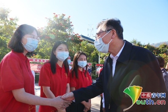 11月20日,中国农业大学校长孙其信一行到云南省镇康县调研定点帮扶和乡村振兴工作,并看望慰问该校第23届研究生支教团云南分队成员。图为孙其信(右)与研支团成员握手。中国农业大学研支团 供图