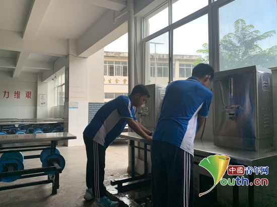 南京工业大学第23届研支团在宁洱镇第一初级中学开展“我为同学做件事——净化美好校园”主题活动。图为宁洱镇第一中学团员青年清理食堂卫生。南京工业大学研支团 供图