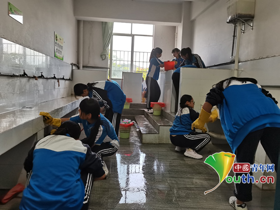 宁洱镇第一中学团员青年清扫卫生间和洗漱台。南京工业大学研支团 供图