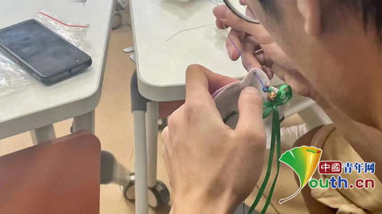 两地师生通过直播、视频等多种形式,共同完成香囊的刺绣作品。苗绣的每一步都容不得半点马虎,他们第一步破线穿针,从三股线中抽出一股,蘸水,增强硬度,便于穿针;第二步利用平绣针法进行刺绣,将香囊正面的字符绣出,加以点缀;最后一步是通过锁边绣将香囊缝合。
