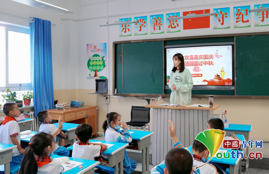 “同学们,我们在欢度‘中国节’的同时,更要知道它们的来历……”,研支团志愿者在“迎中秋,庆国庆”主题班会中,通过视频播放、互动游戏等环节,让学生了解中秋节及国庆节的来历和庆祝方式。在观看往年国庆阅兵式时,志愿者带领学生一同感受祖国发展,激发学生的爱国情怀。
