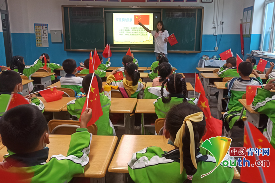 学生们跟随志愿者认识国旗 一同唱响《我和我的祖国》。华中师范大学研支团 供图