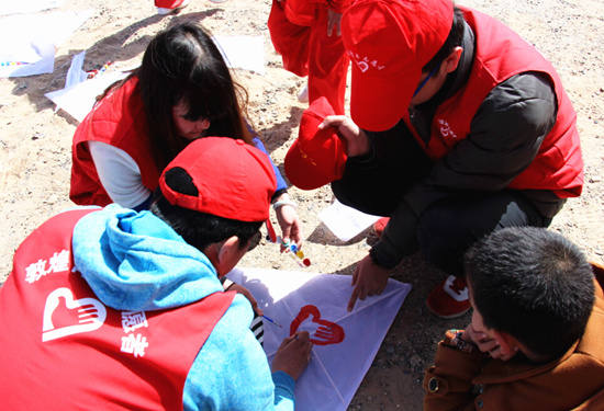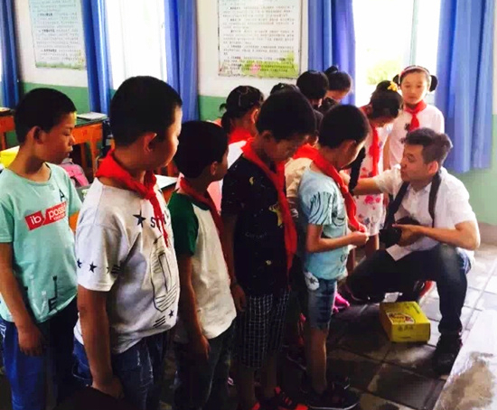 图为朱凌杰与留守儿童制作并放飞爱心风筝。朱凌杰 供图