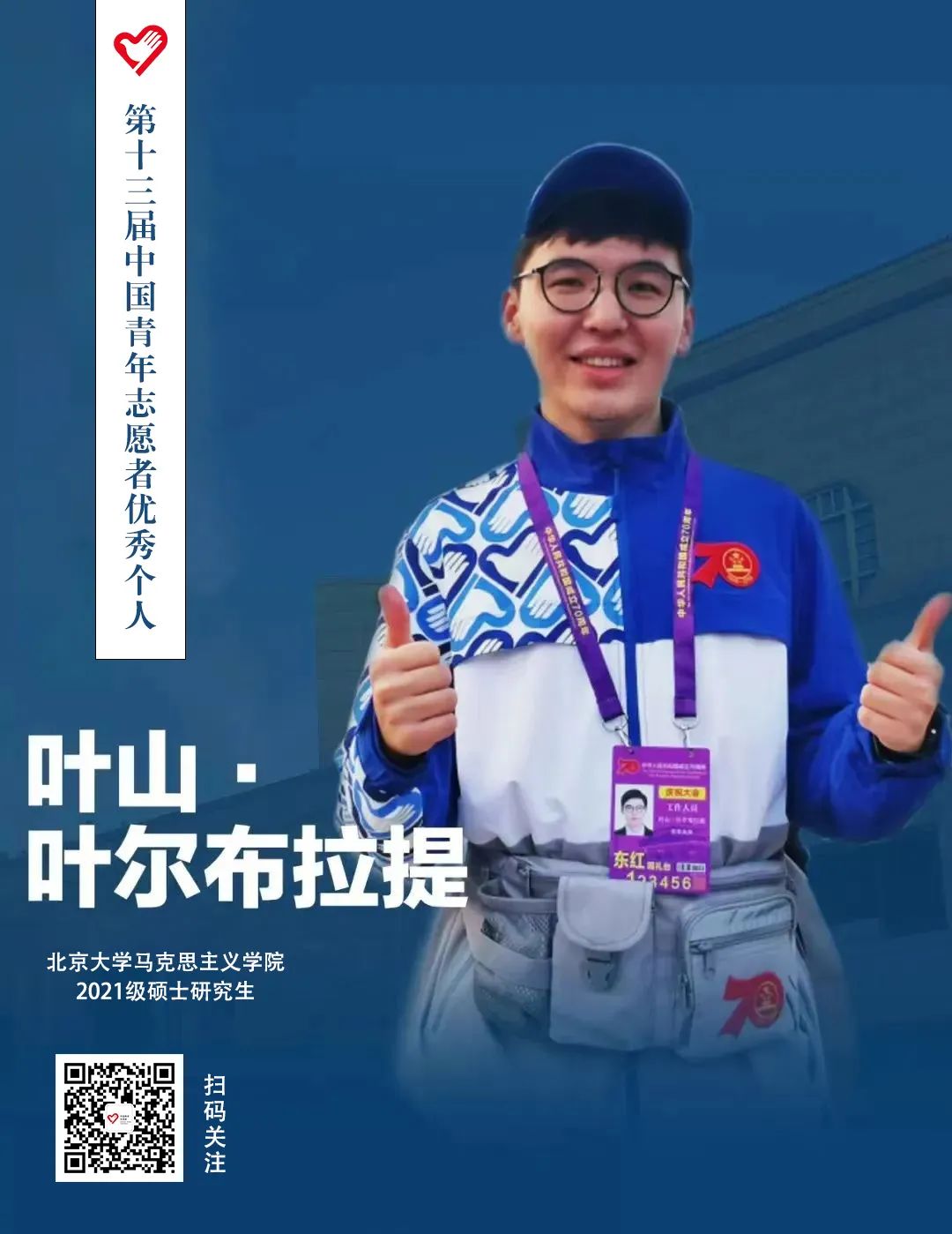 身披新疆天山雪,漫步北大未名湖。一位笑容阳光、目光如炬的哈萨克族青年奔跑在北大校园里,奔波在志愿服务中。在充盈着无限可能性的大学时光里,他将青春倾注于志愿行动。他是第十三届中国青年志愿者优秀个人、北京大学第22届研支团团长、北京大学2021年学生年度人物——叶山·叶尔布拉提。